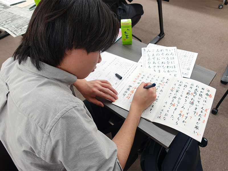 書道研修が始まると、塾生たちは集中した表情で黙々と字の練習に励みました。お習字自体が久しぶりだという塾生が多く、一文字一文字の大きさや力加減を考えなければなりません。まっすぐ書くということ自体が難しいという塾生もいました。高橋先生に添削をしていただく際に、高橋先生は必ず良いところを見つけて褒めてくださいます。その次に文字に対してのアドバイスを下さるのですが、先生は一人ひとりに合わせたアドバイスをしてくださいます。